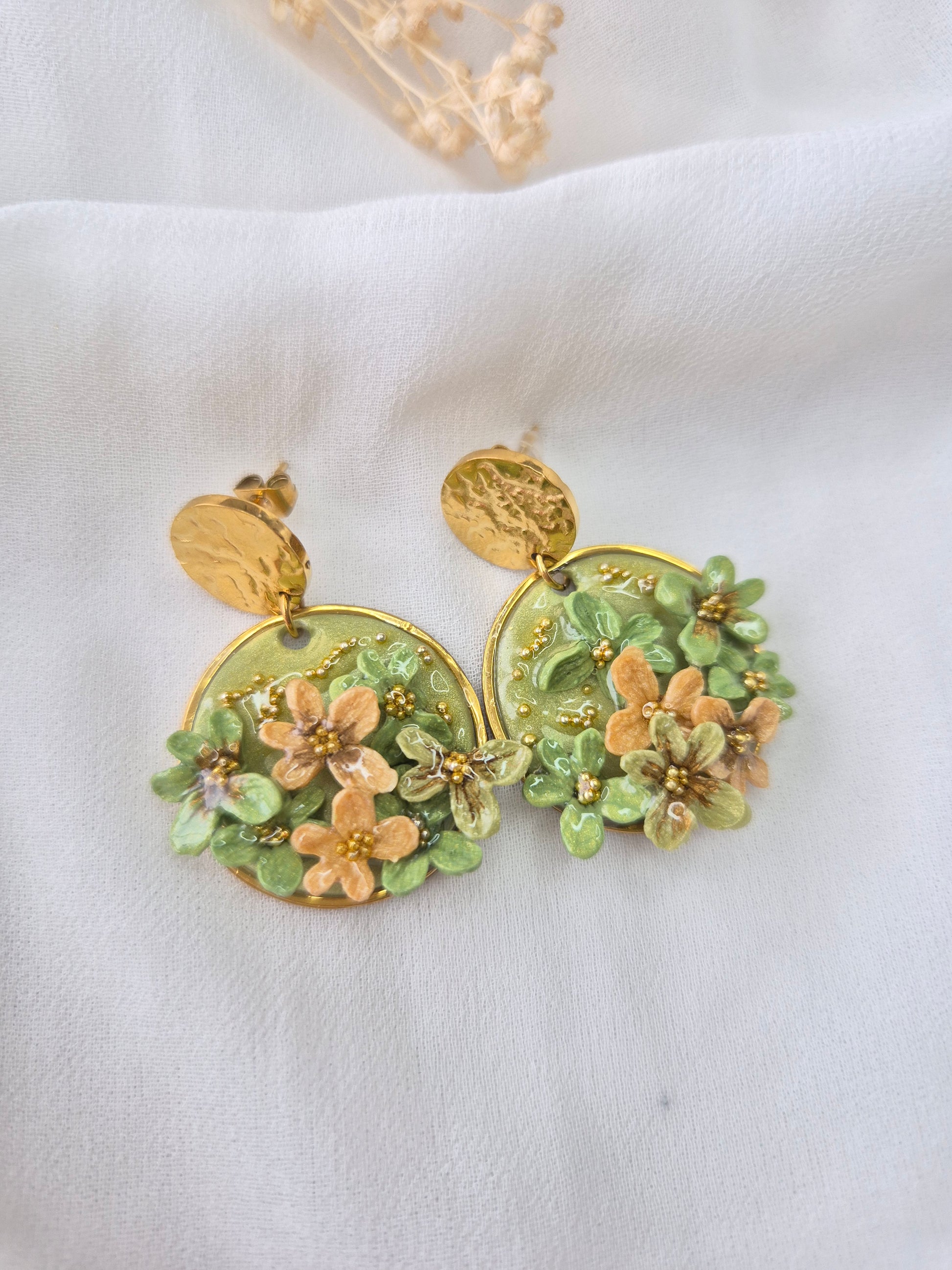 Les boucles d’oreilles Camomille s’inspirent de la délicatesse des fleurs champêtres. Sculptées à la main en pâte polymère, elles dévoilent un assemblage de fleurs beiges et vert tendre, subtilement rehaussées de touches dorées.