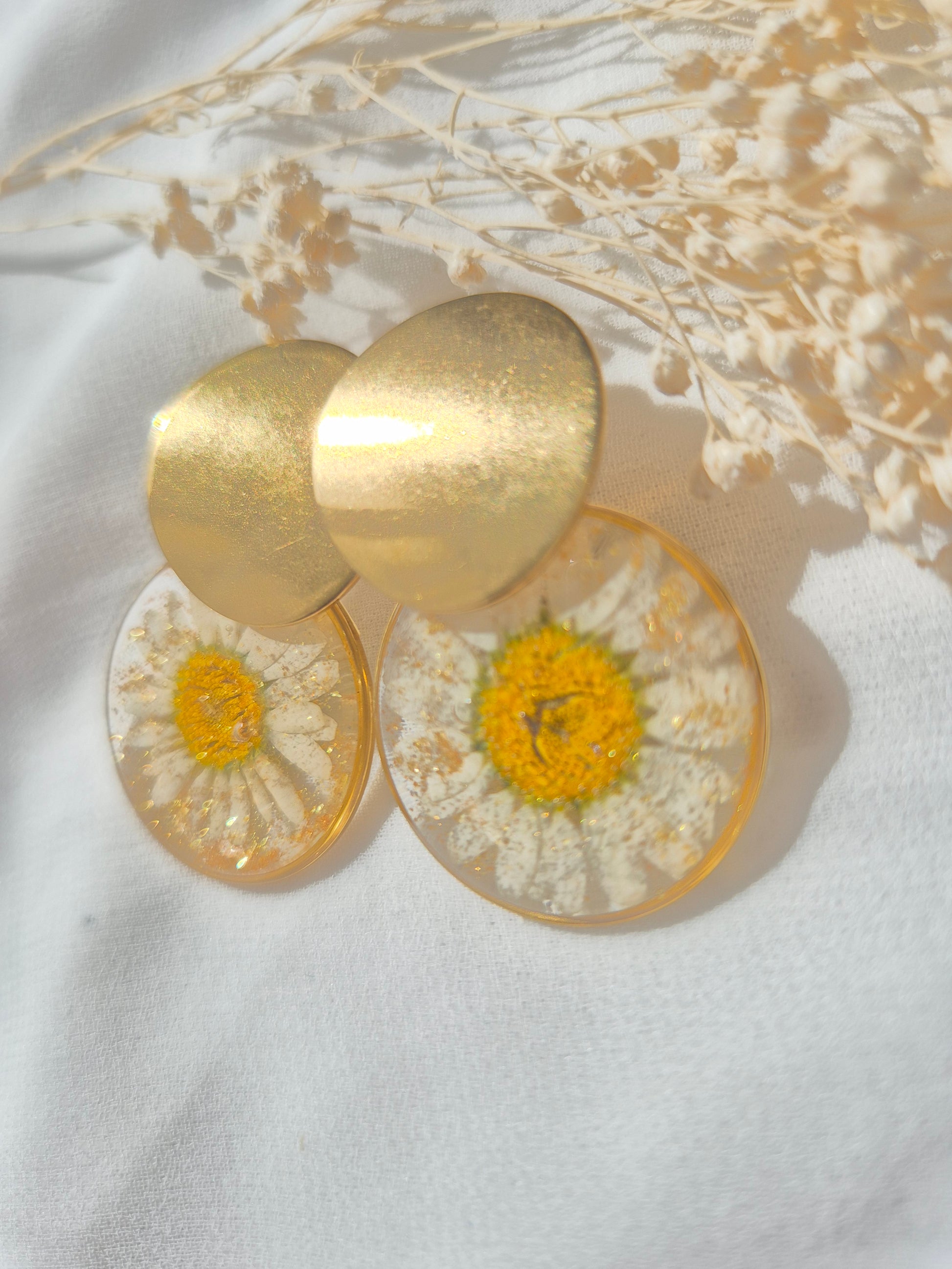 Une fleur qui traverse les époques sans jamais se faner. Les boucles Florence mettent à l’honneur une véritable marguerite séchée, posée sur un fond légèrement pailleté et protégée par une finition brillante en résine UV. Un bijou à la fois champêtre, lumineux et résolument moderne.