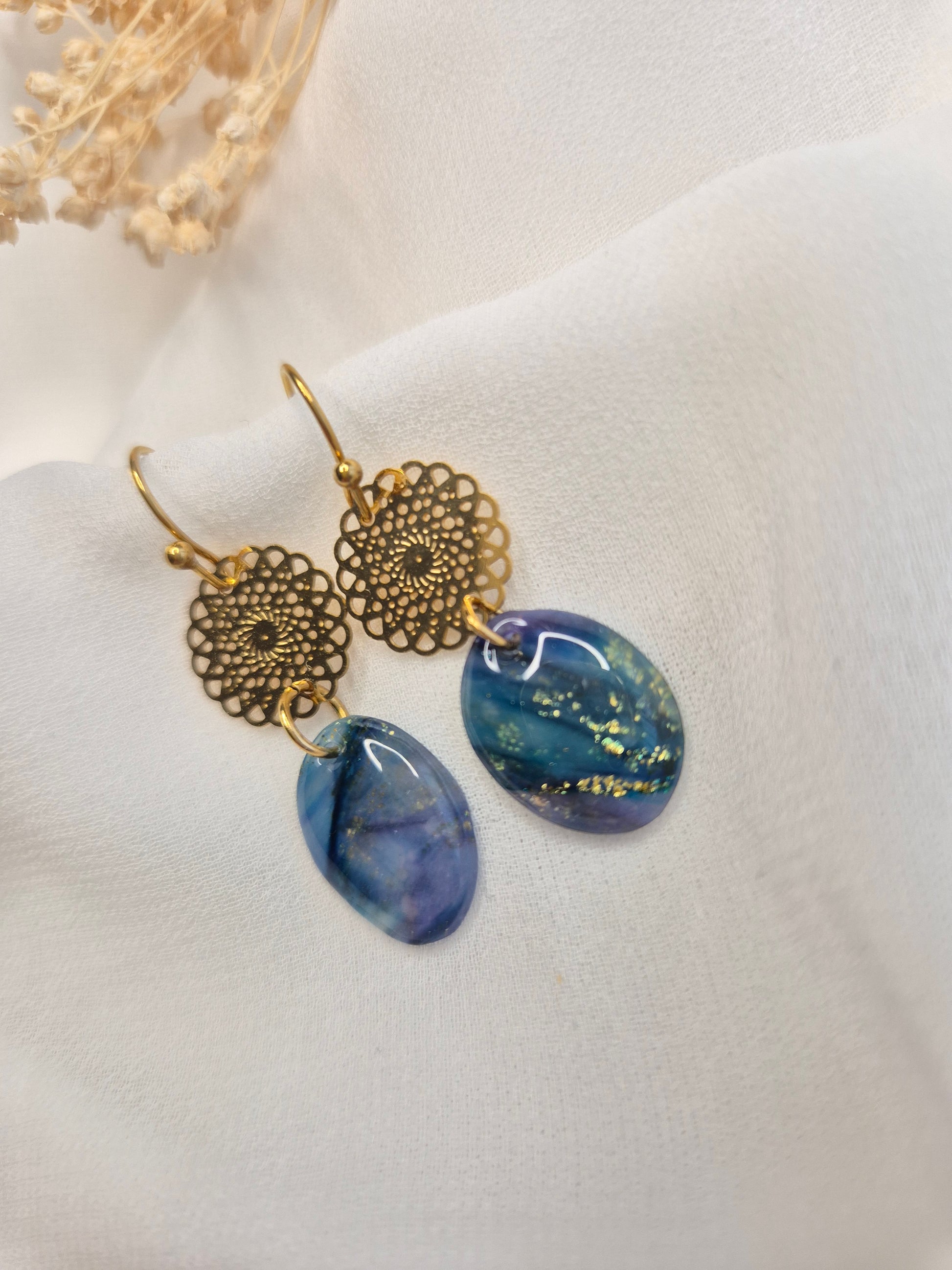 Avec leur médaille dorée ajourée et leur forme ovale en pâte polymère marbrée, elles offrent une allure féminine, lumineuse et intemporelle.