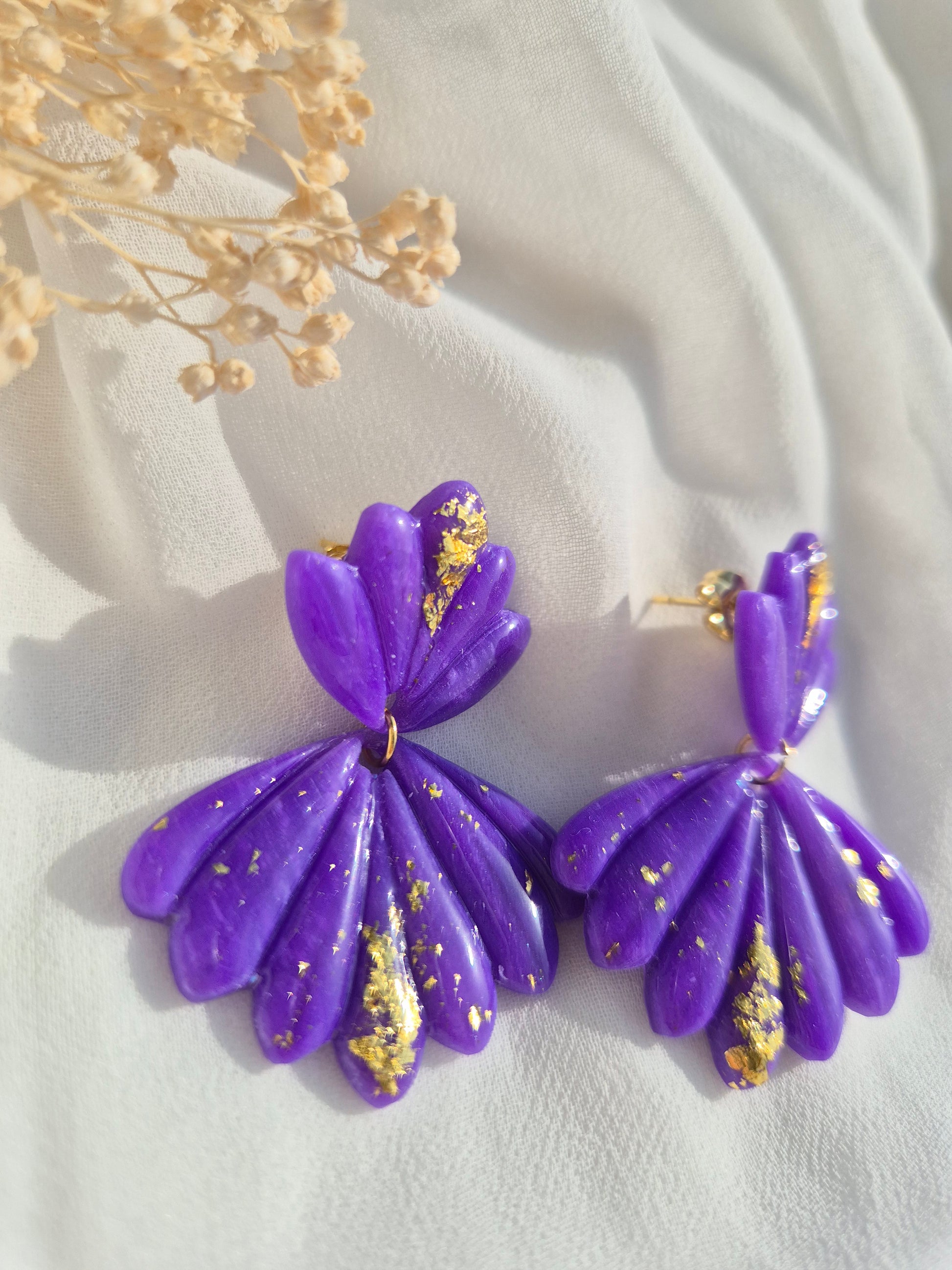 Le modèle Maelis séduit par sa forme florale allongée et aérienne, qui apporte mouvement et élégance à chaque tenue. Chaque pétale, façonné à la main en pâte polymère, est mis en valeur par un éclat brillant obtenu grâce à la résine UV et des touches dorées.