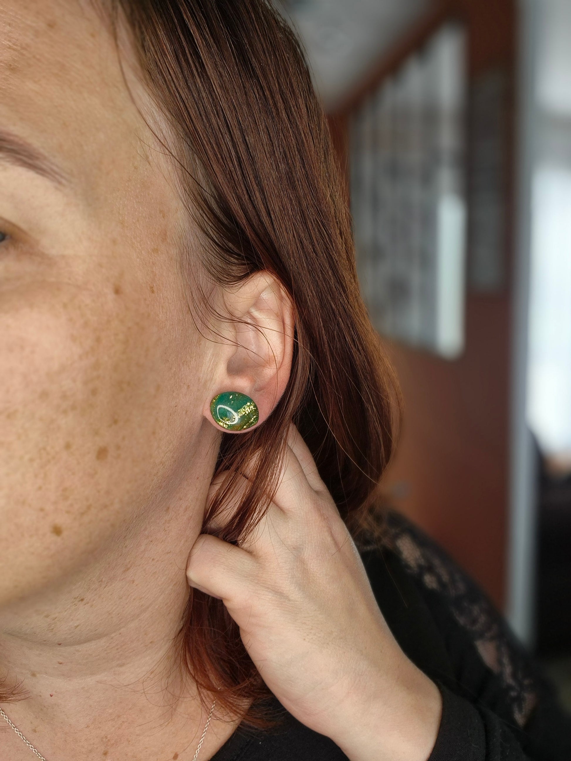 Les puces Liora sont de délicates touches de lumière à vos oreilles. Leur teinte verte, réhaussée de reflets dorés, évoque la beauté minérale et naturelle d’une pierre précieuse.