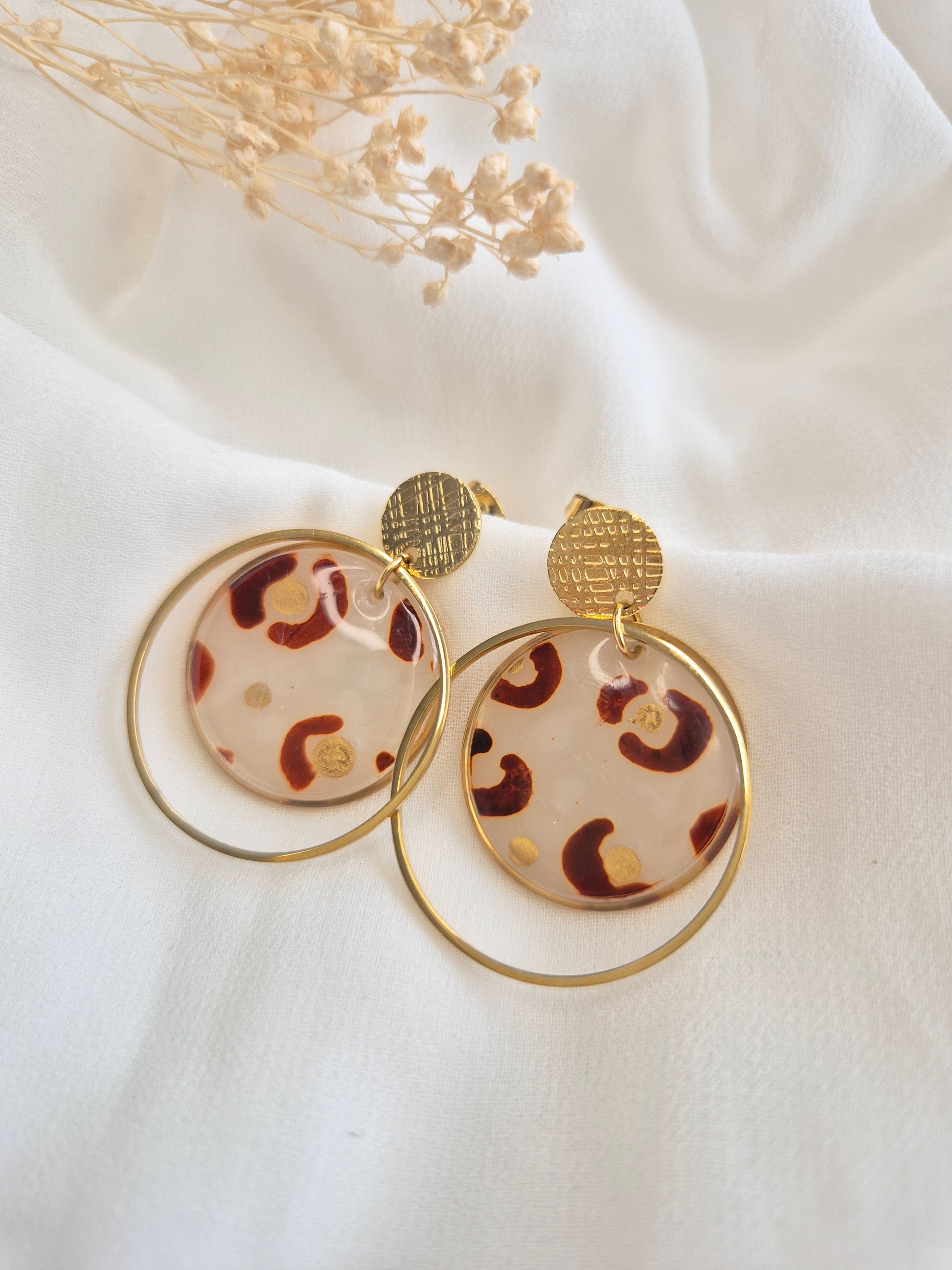 Audacieuses et élégantes, ces boucles d’oreilles se distinguent par leur pendentif rond au motif léopard, peint à la main avec de l’encre à alcool et rehaussé de touches dorées. L’anneau doré qui les entoure apporte légèreté et mouvement, pour un bijou qui attire le regard avec raffinement.